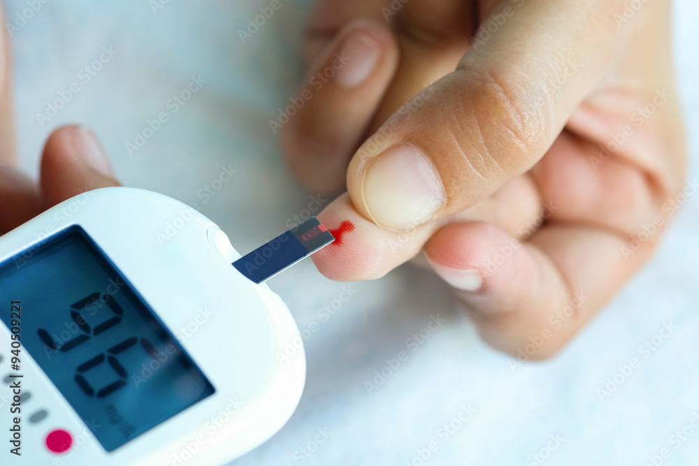 hand of people check diabetes and high blood glucose monitor with digital pressure gauge. Healthcare and Medical concept