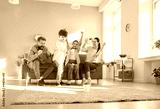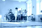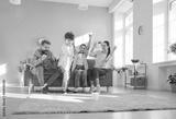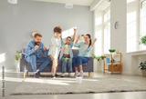 Young smiling parents mother, father and kids having fun together at home on weekend playing and throwing tennis balls into a basket. Happy family, childhood and leisure at home concept.