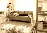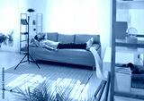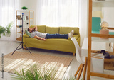 Man getting an intravenous vitamin treatment at home. Happy, relaxed man with an IV drip needle in his arm lying on the sofa in the living room. Vitamin therapy concept