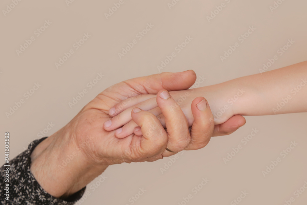 Great grandma and great granddaughter holding hands showing love and affection, close up