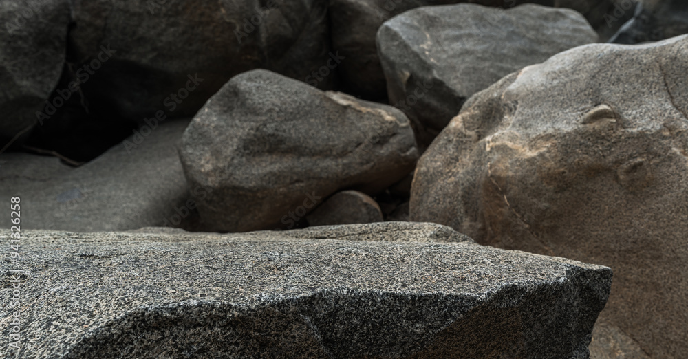 Rock, Stone Podium stand display advertising product, production with natural light background well free space for text, Cliff stone