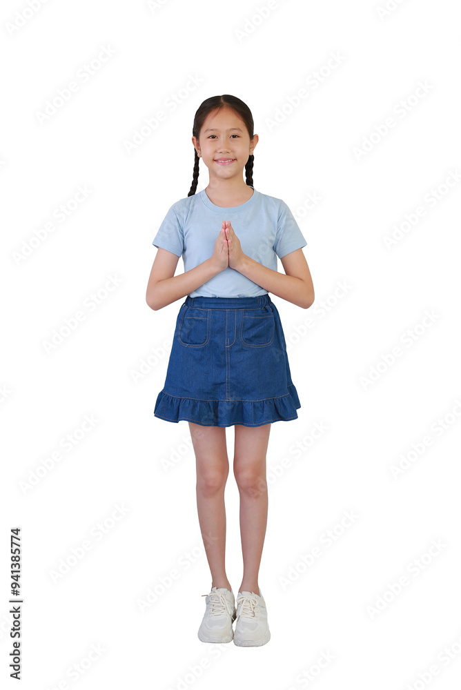 Smiling Asian girl child in neat outfit pay respect or pray gesture isolated on white studio background. Full body photo with clipping path.