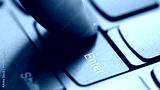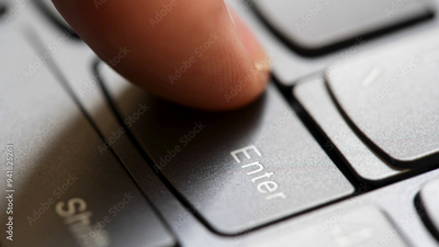 Man quickly pressing the enter key on a modern laptop computer keyboard, macro detail extreme closeup, shallow DOF, one person. Sending a message, buying, accepting rules, running a program concept