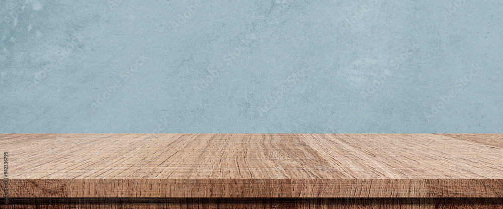 Wood table and blue wall background in kitchen, Wooden shelf, counter for food and product display in room background, Wood table top, desk surface banner, mockup, template