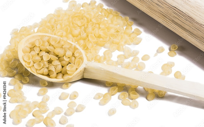 uncooked penne pasta isolated on white background wooden spoon