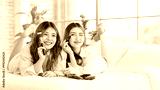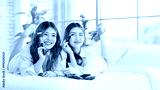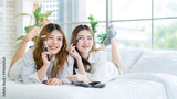 Two happy beautiful Asian female smile lying relaxed on a white bedroom, putting makeup. Attractive woman having fun together trying beauty products, Concept teenage or girlfriends lifestyle at home.