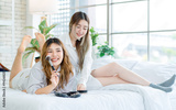 Two happy beautiful Asian female girlfriends with cosmetics make face take care of skin, Attractive women trying beauty products relax on a white bed, Concept teenage or friends lifestyle at home.