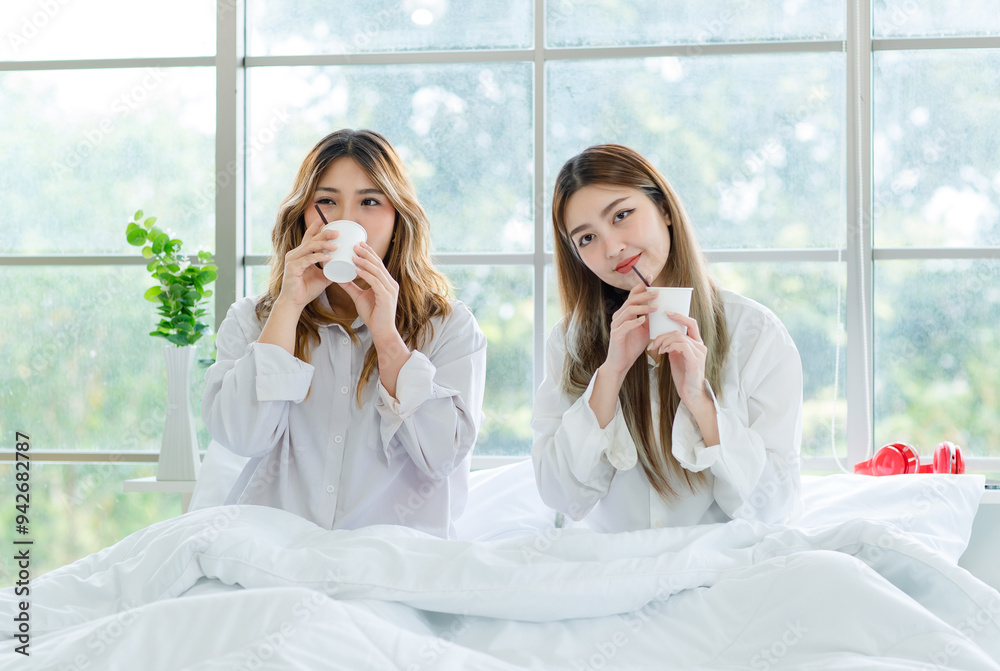 Two beautiful people happy Asian females drinking hot coffee or tea with bread or cake. Pretty woman laughing and talking relaxed funny on a white bed, Concept teenage or friends lifestyle at home.