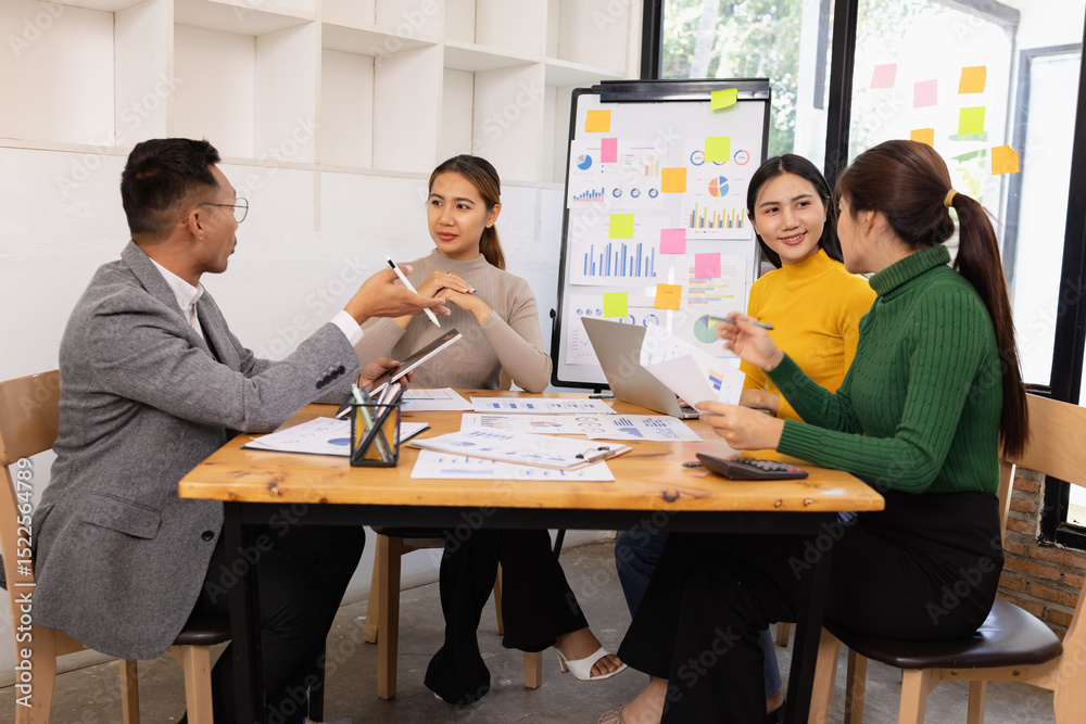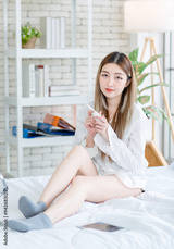 Asian young woman beautiful female happy smiling enjoying with decorative makeup, beauty products, and cosmetics while sitting on white bed, Concept of teenage lifestyle at home