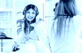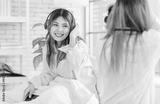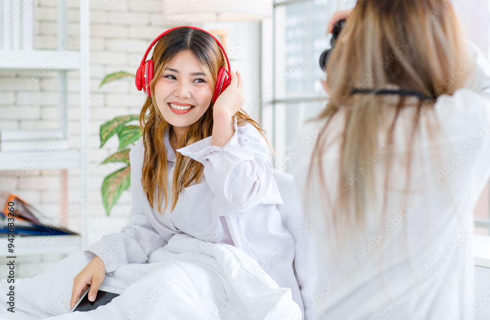 Two funny happy friends, Asian young woman pretty female smiling enjoying holding a vintage camera and taking photo of friend while sitting in bed. Concept teenage lifestyle hobby and art photography