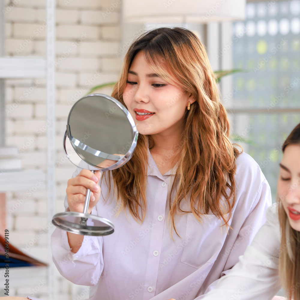 Two happy beautiful Asian female girlfriends cosmetics make face take care of skin beauty products, Pretty woman looking at mirror relaxed on a white bed, Concept teenage or friends lifestyle at home.