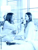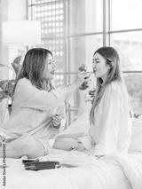 Two happy beautiful Asian female girlfriends cosmetics make face take care of skin beauty products, Pretty woman looking at mirror relaxed on a white bed, Concept teenage or friends lifestyle at home.