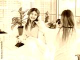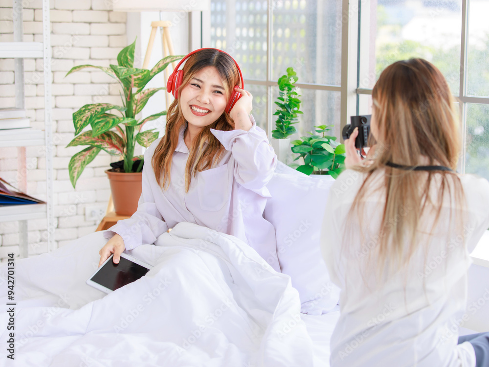 Two funny happy friends, Asian young woman pretty female smiling enjoying holding a vintage camera and taking photo of friend while sitting in bed. Concept teenage lifestyle hobby and art photography