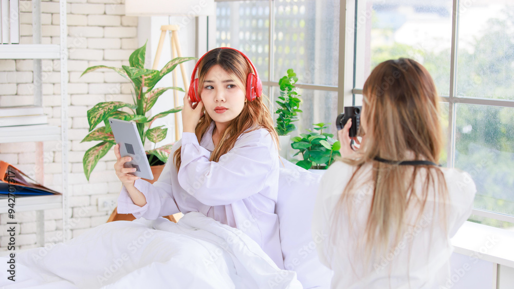 Two funny happy friends, Asian young woman pretty female smiling enjoying holding a vintage camera and taking photo of friend while sitting in bed. Concept teenage lifestyle hobby and art photography