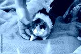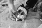 A boy plays in the park with a fluffy brown and white guinea pig.