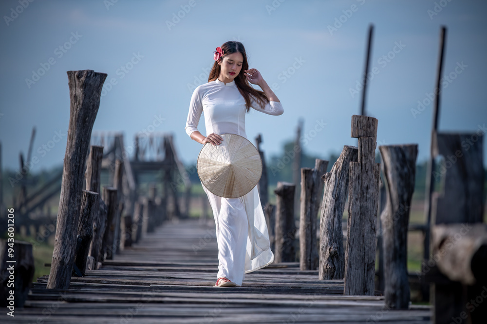 Beautiful woman dressed in a traditional Vietnamese national garment, standing on a wooden bridge with a misty and serene landscape, contributing to the tranquil and cultural ambiance of the scene.