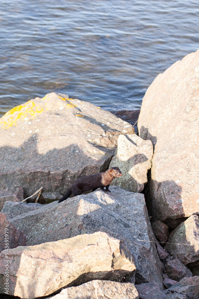 Nerz klettert in natürlicher Umgebung um Felsen herum. Bedrohte Tierart in Europa. Mink climb around rocks in a natural environment. Endangered species in Europe.