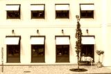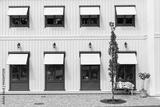 Grüne Fenster vor weißer Holzfassade. Skandinavische Architektur. Green windows in front of a white wooden façade. Scandinavian architecture.