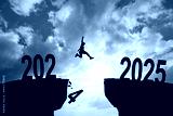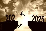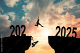 Welcome Merry Christmas in 2025. A young man jump between 2024 and 2025 years over the sun and through on the gap of hill silhouette evening colorful sky. Happy new year. Vector illustration.