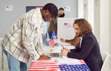 Side view portrait african american man registering at polling station with American flags on election day. Young USA citizen voter standing at vote center and getting ballot paper.