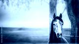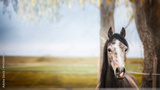 horse standing and looking at camera over nature background wit tree and foliage, banner