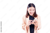 Smilling happy young asian business woman using mobile phone Young lady using smartphone for shopping online chat and texting message
