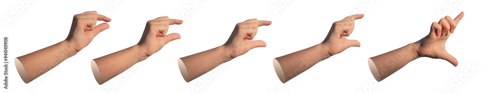 Kids hand gestures showing size from big to small. Pinch, catch, hold, isolated on white. grabbing, comparing, seizing, set.