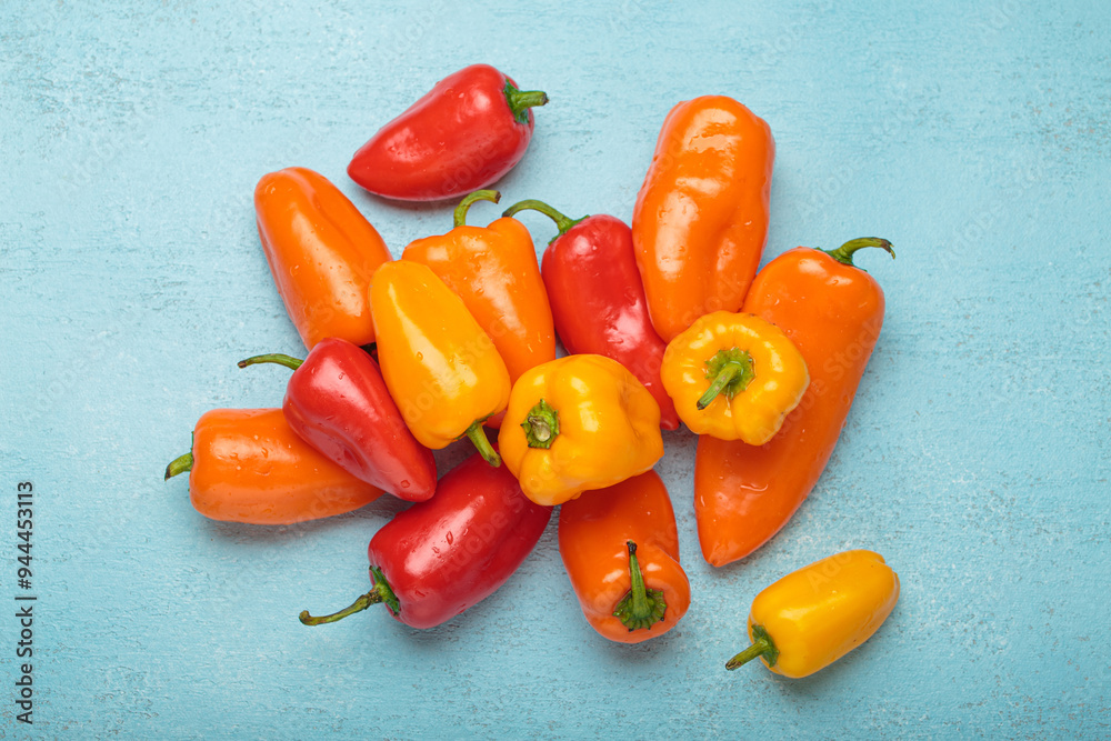 Scattering of fresh red, orange, and yellow sweet mini peppers are lying on a blue tabletop. The bright colors of the vegetables pop against the pastel blue background