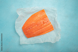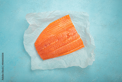 Fresh salmon fillet on wooden board against blue background, promoting healthy eating and gourmet cooking. Rich in omega fatty acids and protein. Perfect for a tasty, home cooked meal