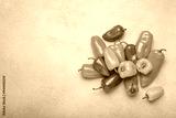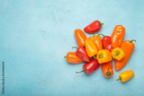 Scattering of fresh red, orange, and yellow sweet mini peppers are lying on a blue tabletop. The bright colors of the vegetables pop against the pastel blue background, copy space