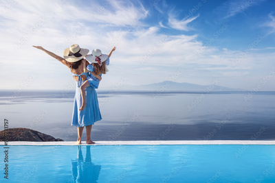 A happy mother and her daughter are standing by the pool and enjoying the summer sunset over the mediterranean sea
