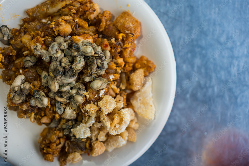 Phuket traditional food called O-tao mixed with oysters, steamed taro and eggs served with pork kappa and eating with spicy sauce, found only in Phuket Thailand. Phuket local street food