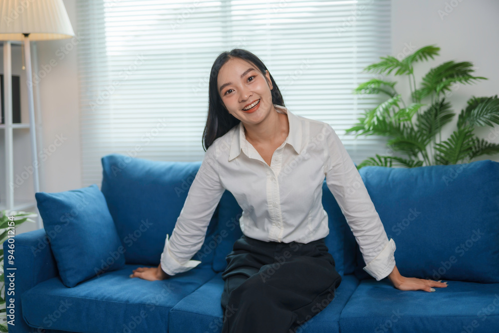 Young businesswoman is sitting on a blue sofa in her living room, smiling towards the camera