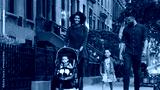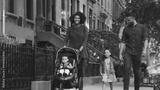 Family Day Out With Mum Pushing Baby In Buggy As They Walk Along Urban Street In New York City USA