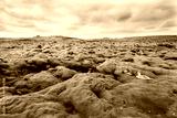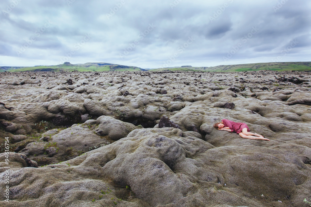 beautiful girl in red dress sleeping in lava field in Iceland, solitude concept