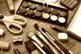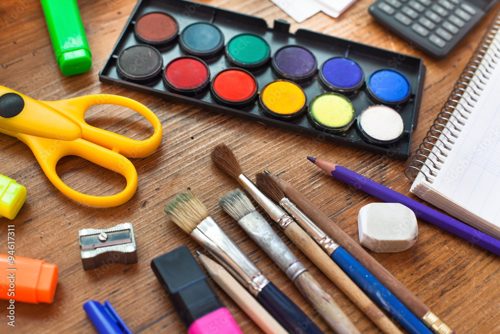school supplies on wooden table