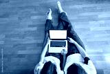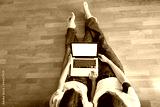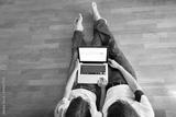 couple sitting in their new house with laptop