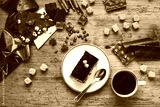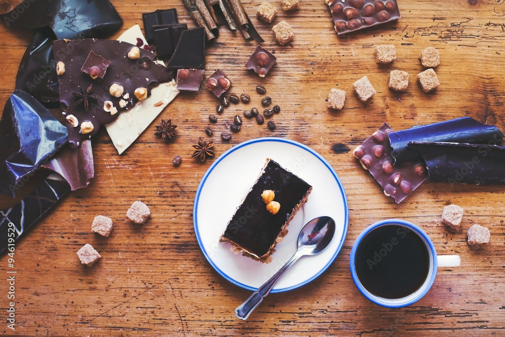 chocolate cake and coffee on the table, sweet dessert