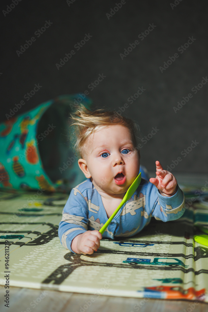 Cute blond toddler boy playing with baby toys at home sitting on carpet in living room. Smiling cute little child using colorful toys, chewing teether