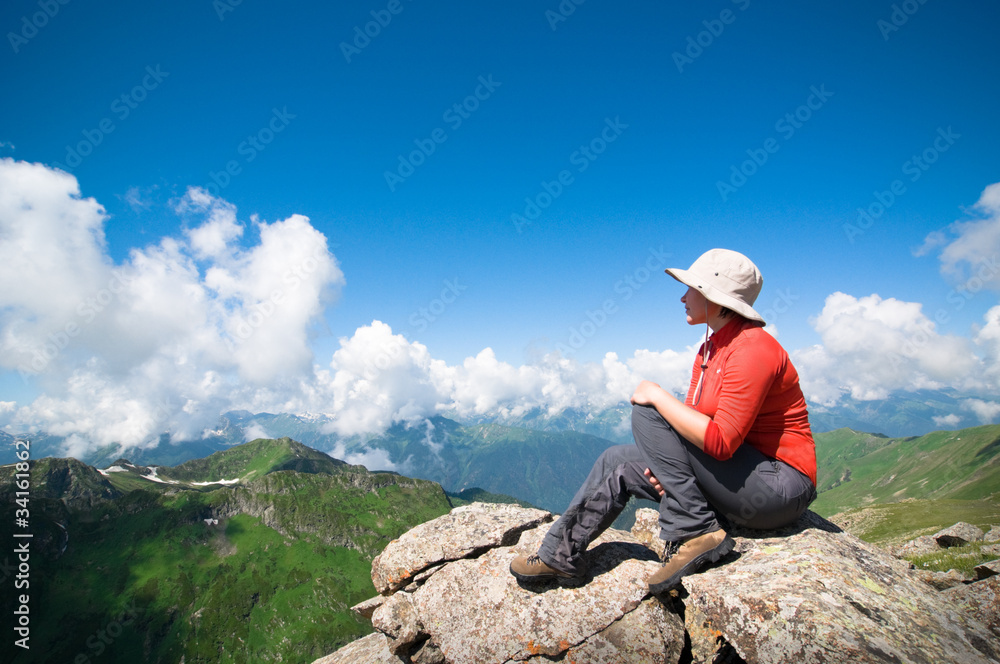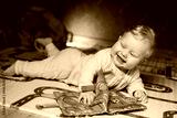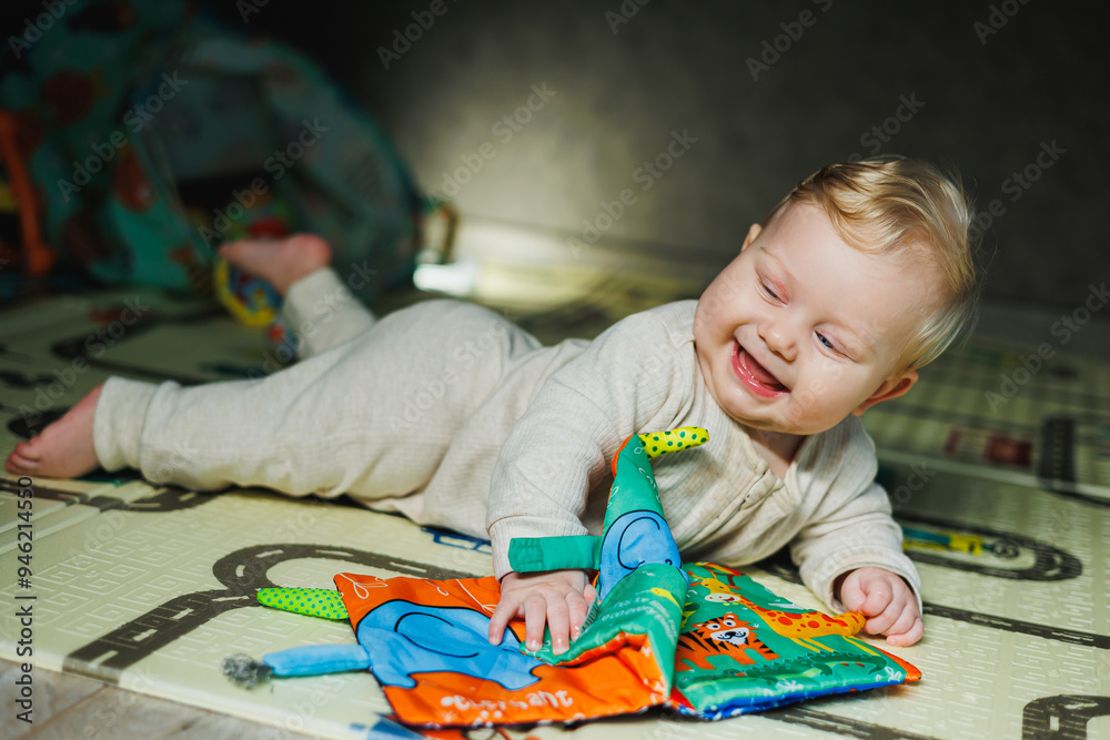 Cute blond toddler boy playing with baby toys at home sitting on carpet in living room. Smiling cute little child using colorful toys, chewing teether