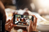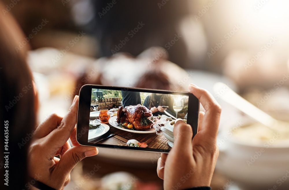 Turkey, mobile or hands taking picture at restaurant for food photography, social media or status update. Screen closeup, influencer or woman at cafeteria for blog, meal post or chicken review online