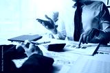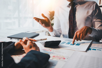 Two businessmen having a conversation while analyzing charts and using a calculator