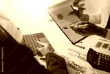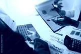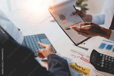 Business partners reviewing financial reports and pointing at charts while planning their next move for success