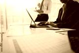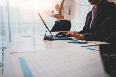Businesswoman working on a tablet and typing on a keyboard with a colleague standing in the background discussing work