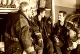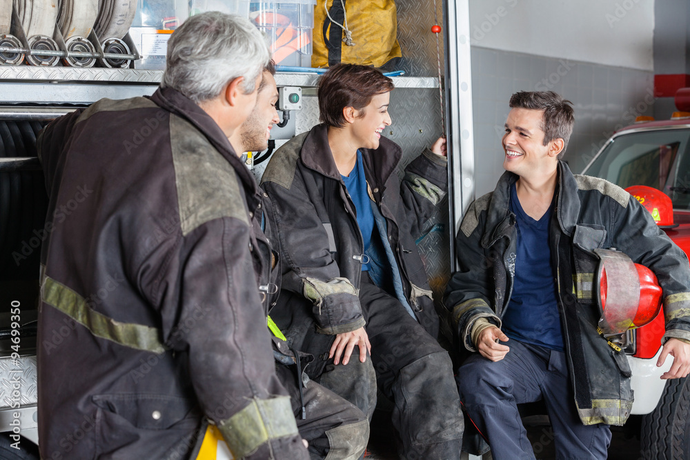 Firefighters Conversing By Truck At Fire Station