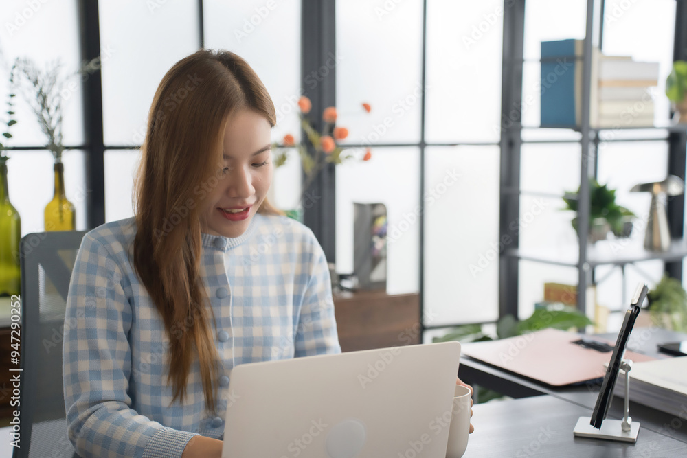 An Asian female businesswoman in a blue-checkered shirt is focused on working on her laptop at a modern office desk, surrounded by neatly organized files and office supplies