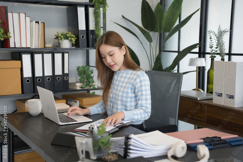 An Asian female businesswoman in a blue-checkered shirt is reviewing documents at her desk, with a laptop open, concentrating on her work in a modern office environment.