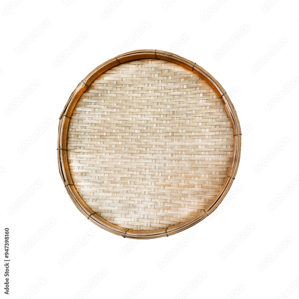 Isolated round bamboo tray is a container woven with bamboo, flat shape and rounded edges, used for drying various things. There are many beautiful patterns to choose from.
