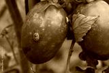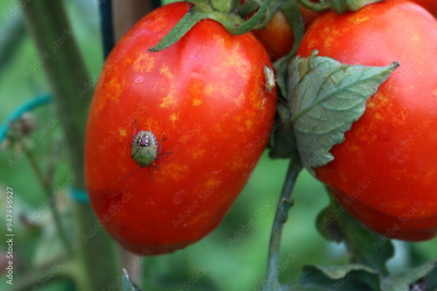 Green shield bug on red ripe tomato in the vegetable garden. Nezara viridula insect on damaged cultivation