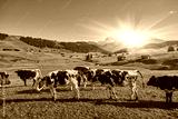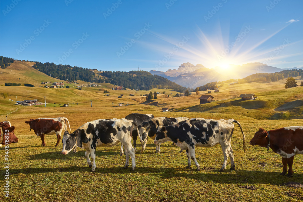 cows in high mountain pastures in autumn with rocky mountains with snow and colorful trees plateau of Siusi Alps in Trentino, taly